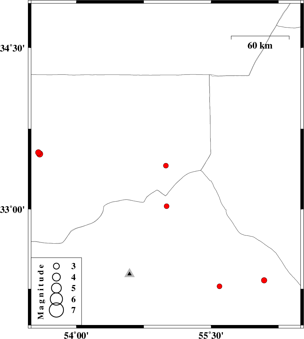 | 2017/07/20 | 15:54:42.6 | 20:24:42.6 | 33.516 | 53.591 | 14 | ML:3.3 | Esfahan Province, 86 km North-East of Nain | ||