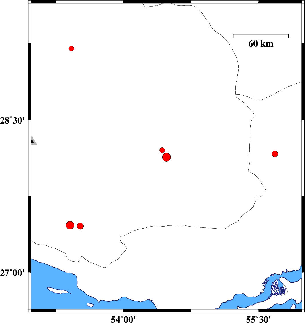 | 2017/08/10 | 13:50:15.3 | 18:20:15.3 | 27.464 | 53.409 | 15 | ML:3.9 | Fars Province, 28 km North-East of Lamerd | ||