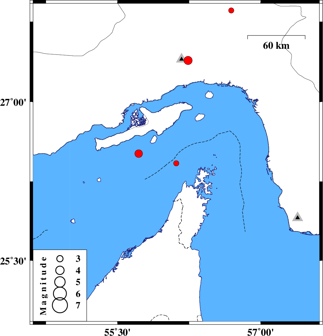 | 2017/08/13 | 10:17:32.8 | 14:47:32.8 | 26.421 | 56.115 | 20 | ML:2.6 | Persian Gulf, 61 km South-West of Qeshm | ||
