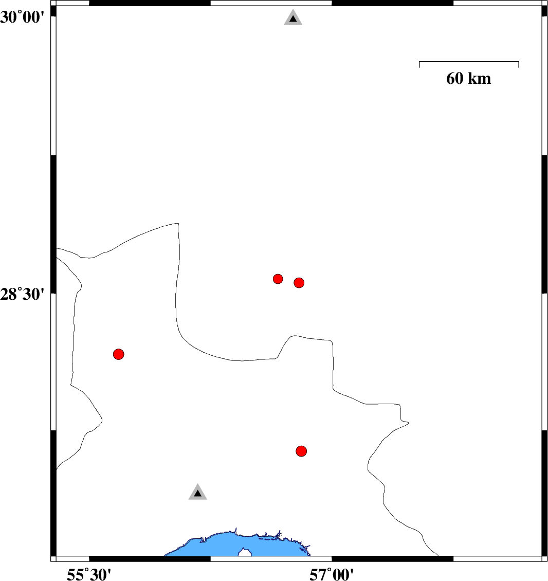 | 2017/08/06 | 10:57:38.3 | 15:27:38.3 | 28.578 | 56.666 | 16 | ML:2.7 | Kerman Province, 73 km South of Baft | ||