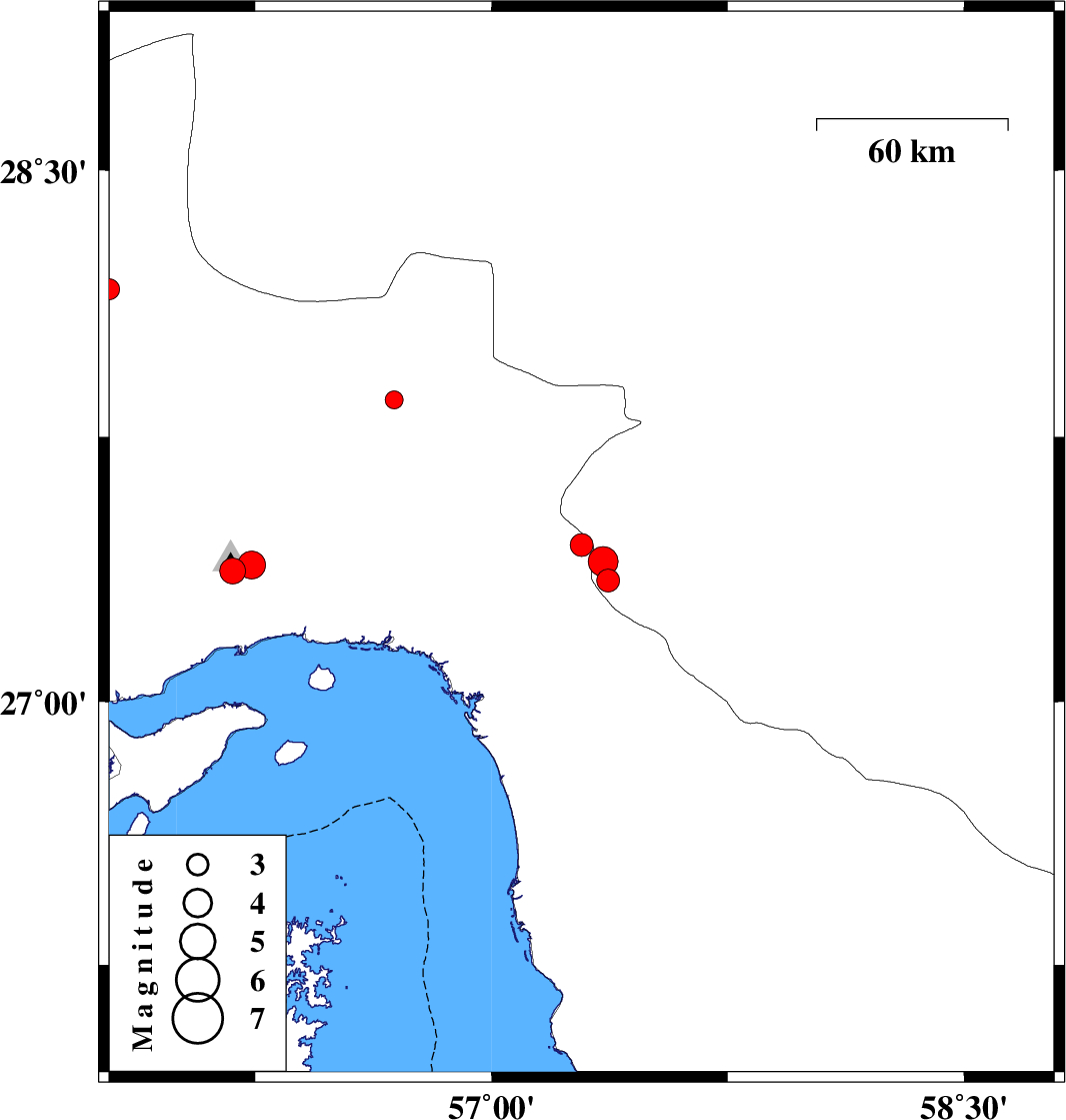| 2017/08/14 | 11:14:10.3 | 15:44:10.3 | 27.397 | 57.354 | 18 | ML:4.2 | Kerman Province, 12 km -East of Dehbarez | ||