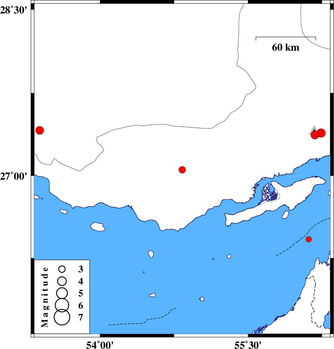 | 2017/08/13 | 10:17:32.8 | 14:47:32.8 | 26.421 | 56.115 | 20 | ML:2.6 | Persian Gulf, 61 km South-West of Qeshm | ||