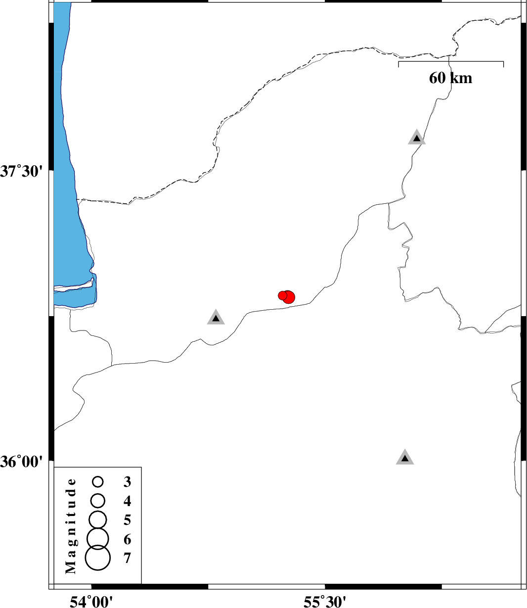 | 2017/08/21 | 07:49:29.0 | 12:19:29.0 | 36.854 | 55.259 | 6 | ML:3.3 | Golestan Province, 20 km South-East of Ramian |