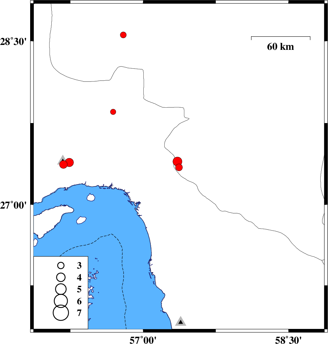| 2017/08/14 | 11:14:10.3 | 15:44:10.3 | 27.397 | 57.354 | 18 | ML:4.2 | Kerman Province, 12 km -East of Dehbarez | ||