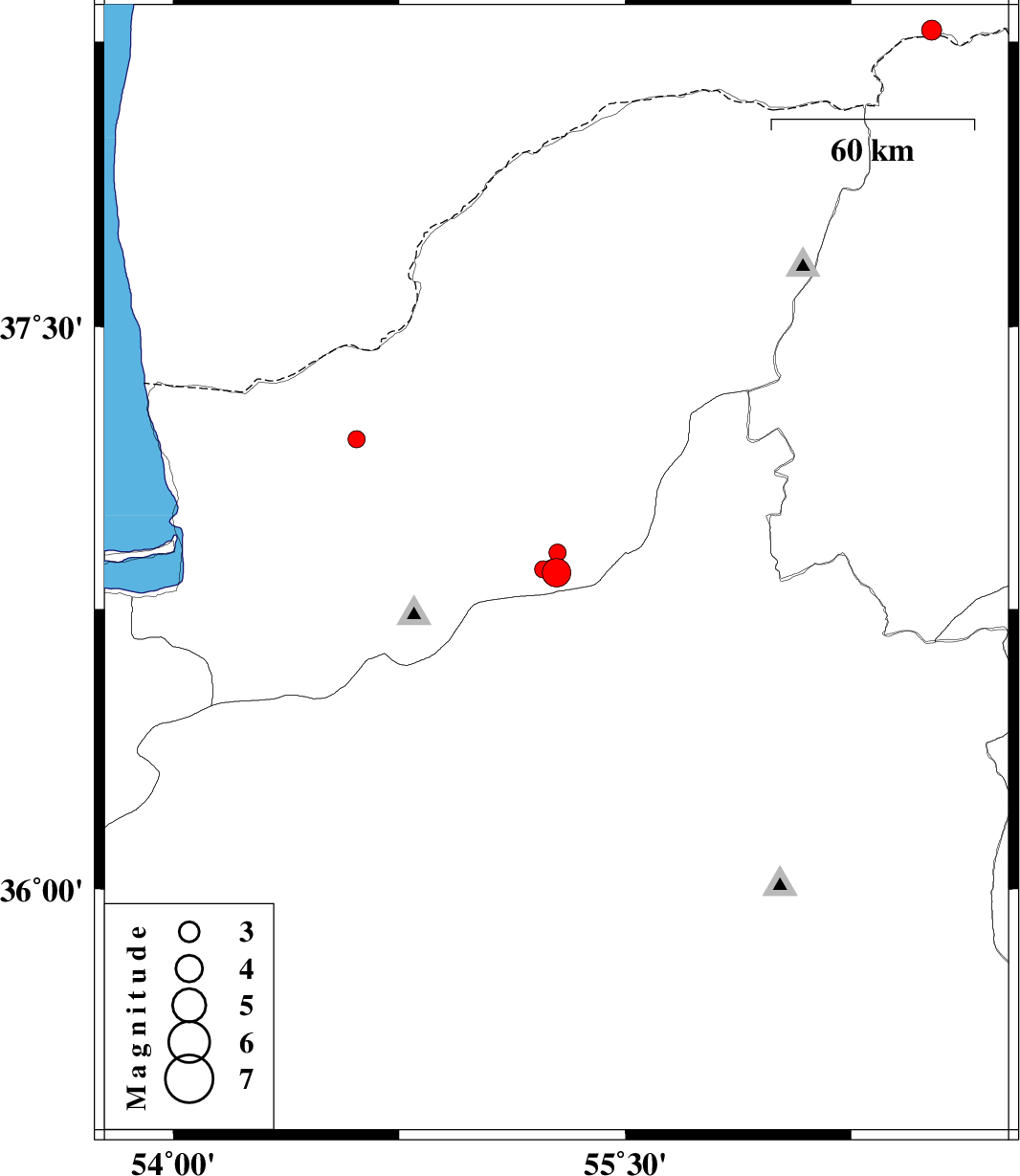 | 2017/08/21 | 07:49:29.0 | 12:19:29.0 | 36.854 | 55.259 | 6 | ML:3.3 | Golestan Province, 20 km South-East of Ramian | ||