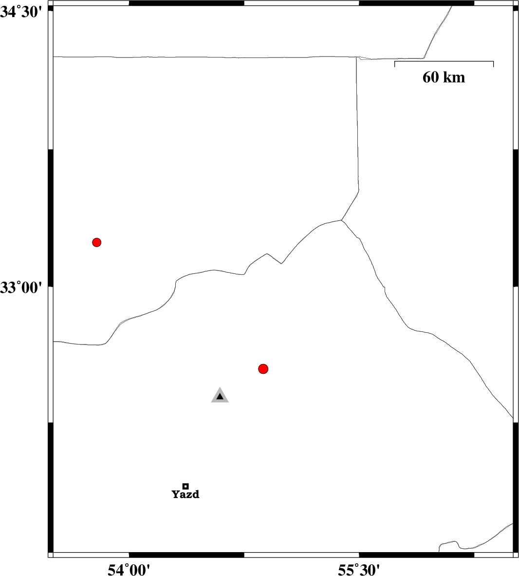 | 2017/08/01 | 00:02:56.8 | 04:32:56.8 | 32.331 | 56.09 | 14 | ML:2.8 | Yazd Province, 104 km North-East of Bafq |