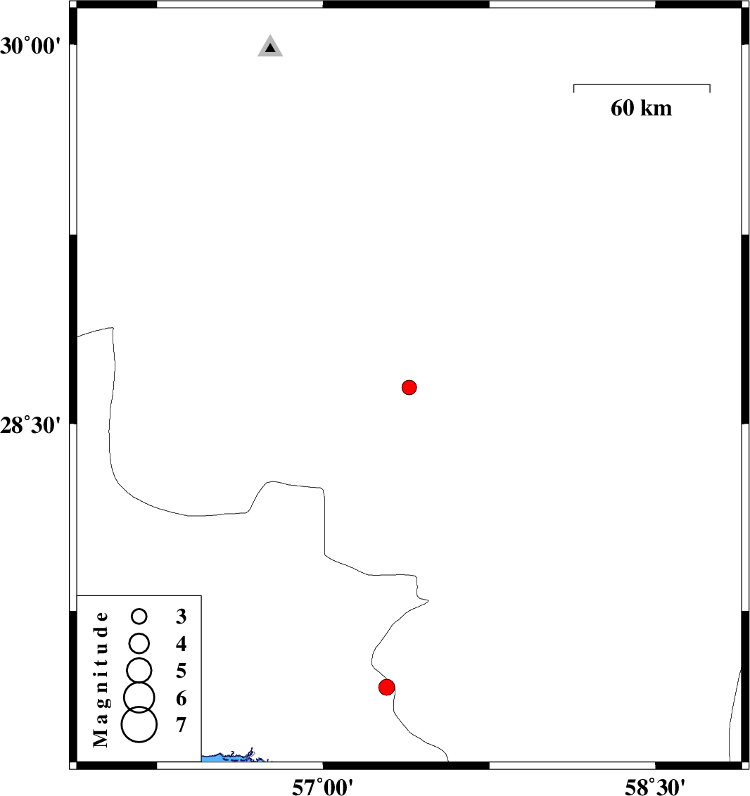 | 2017/08/25 | 16:33:26.5 | 21:03:26.5 | 28.643 | 57.388 | 17 | ML:3 | Kerman Province, 34 km -West of Jiroft | ||