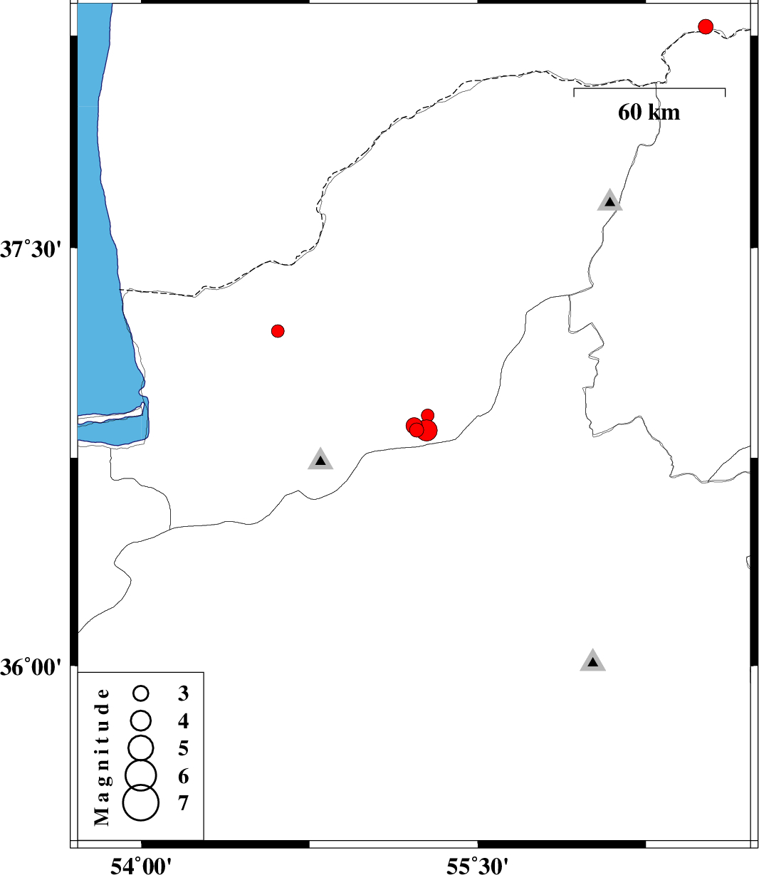 | 2017/08/21 | 07:55:08.3 | 12:25:08.3 | 36.856 | 55.228 | 6 | ML:2.5 | Golestan Province, 19 km South of Ramian | ||