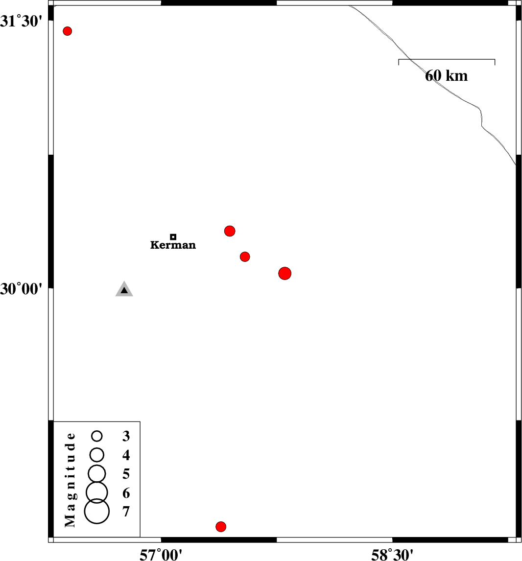 | 2017/08/27 | 21:46:20.4 | 02:16:20.4 | 30.083 | 57.802 | 6 | ML:3.7 | Kerman Province, 73 km South-East of Kerman | ||