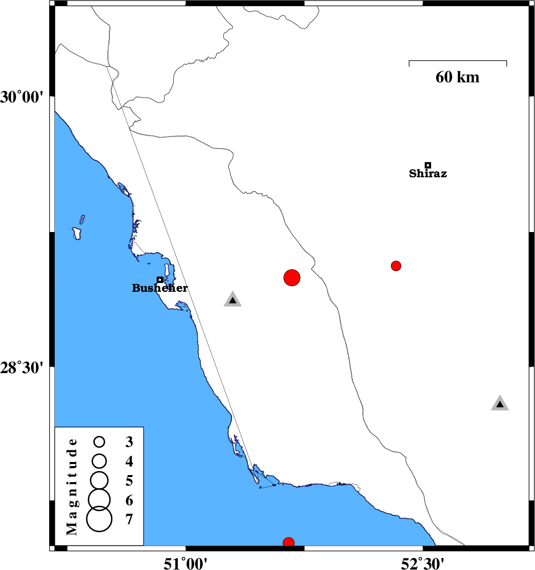 | 2017/09/03 | 12:48:59.1 | 17:18:59.1 | 28.996 | 51.671 | 13 | ML:4.7 | Bushehr Province, 42 km North-East of Ahram | ||