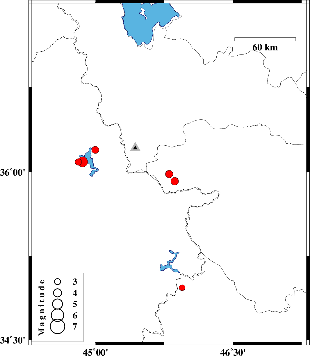 | 2017/08/30 | 10:31:07.1 | 15:01:07.1 | 35.981 | 45.803 | 15 | ML:3.6 | Kurdistan Province, 8 km of Baneh | ||