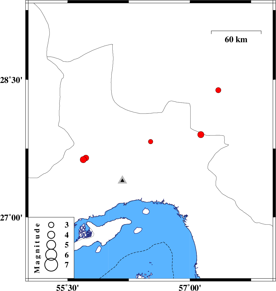 | 2017/09/06 | 00:55:07.8 | 05:25:07.8 | 28.386 | 57.349 | 14 | ML:2.9 | Kerman Province, 49 km South-West of Jiroft |