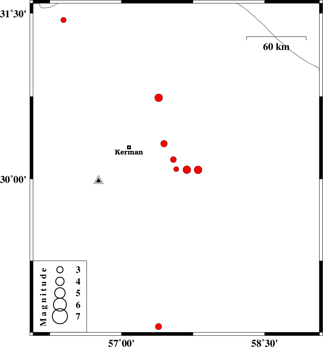 | 2017/08/27 | 21:46:20.4 | 02:16:20.4 | 30.083 | 57.802 | 6 | ML:3.7 | Kerman Province, 73 km South-East of Kerman | ||