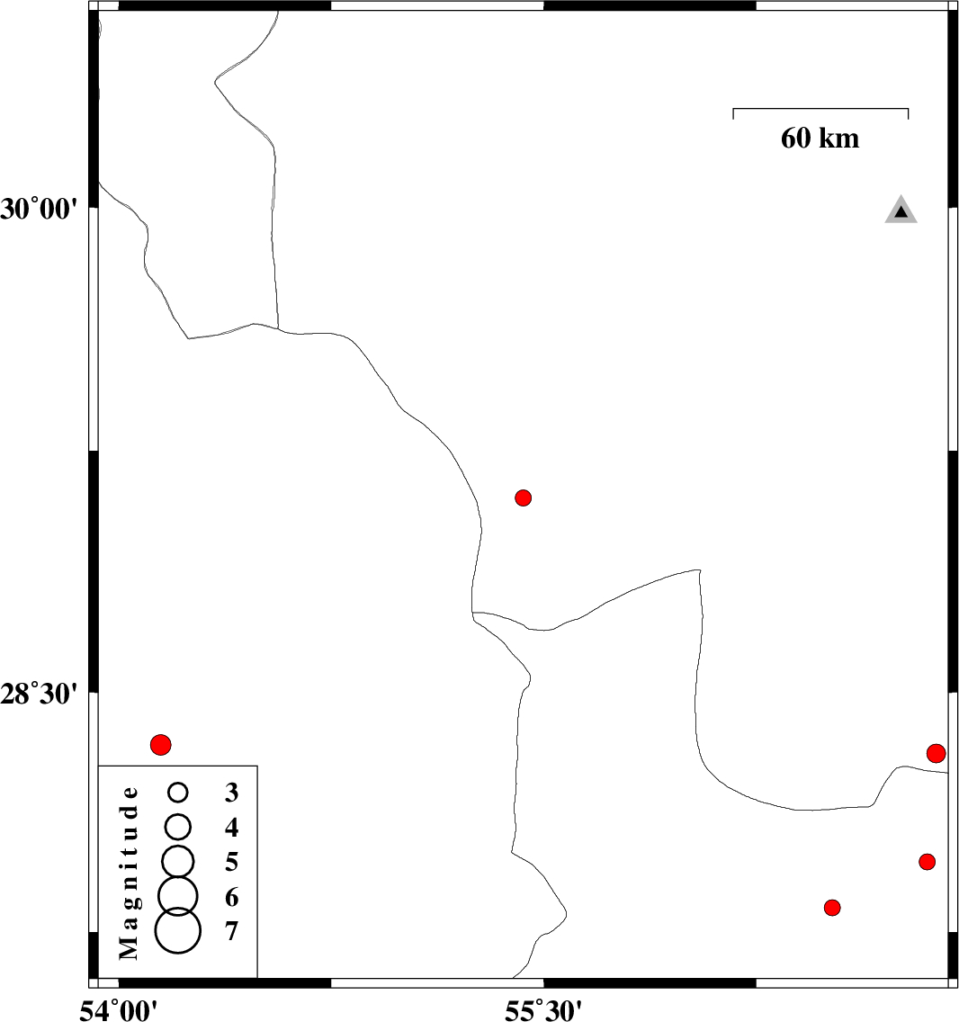 | 2017/09/17 | 11:10:27.7 | 15:40:27.7 | 28.335 | 54.148 | 16 | ML:3.3 | Fars Province, 60 km South-East of Jahrom | ||
