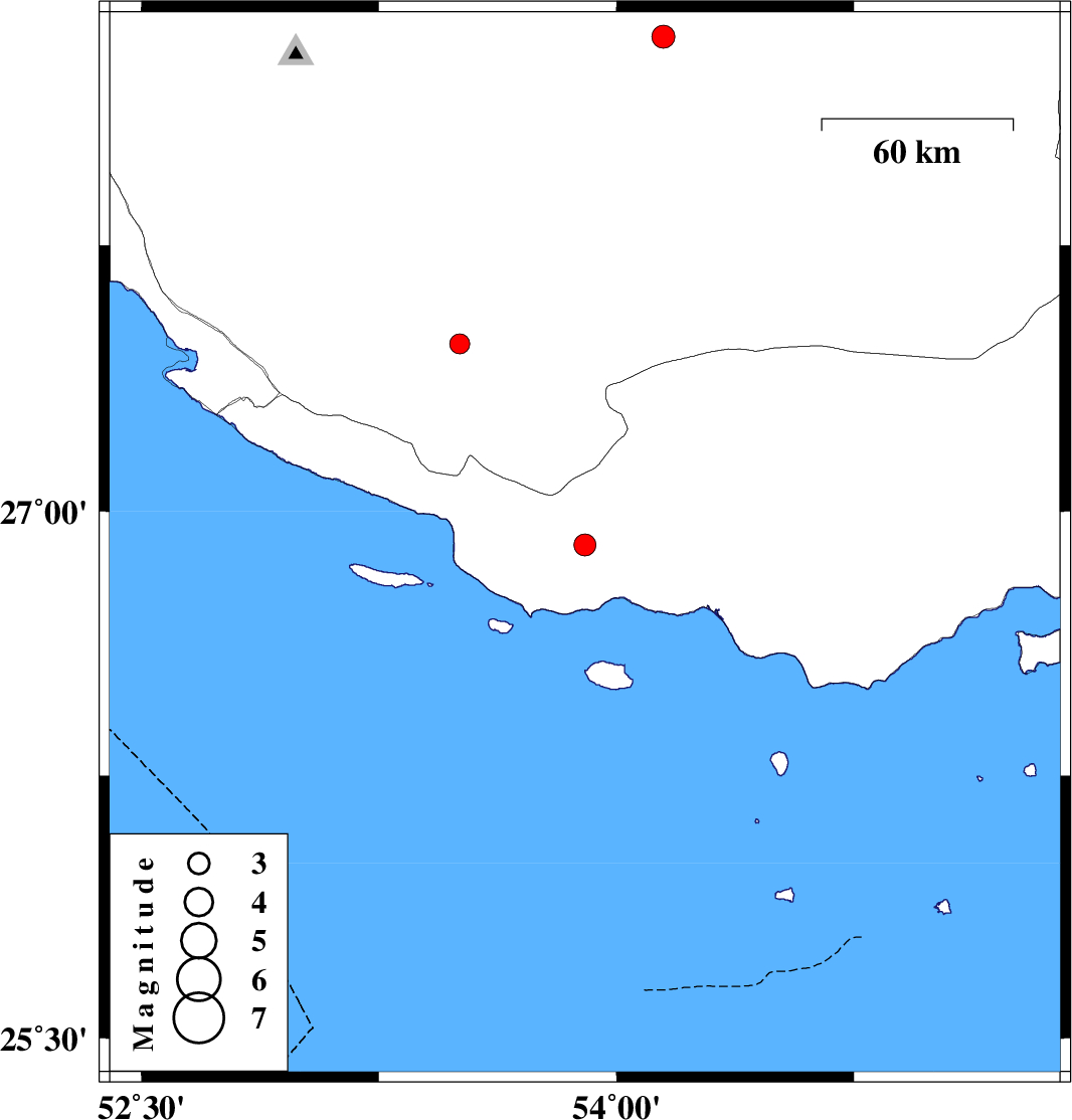| 2017/09/17 | 23:54:25.0 | 04:24:25.0 | 27.473 | 53.505 | 15 | ML:2.8 | Fars Province, 37 km North-East of Lamerd | ||