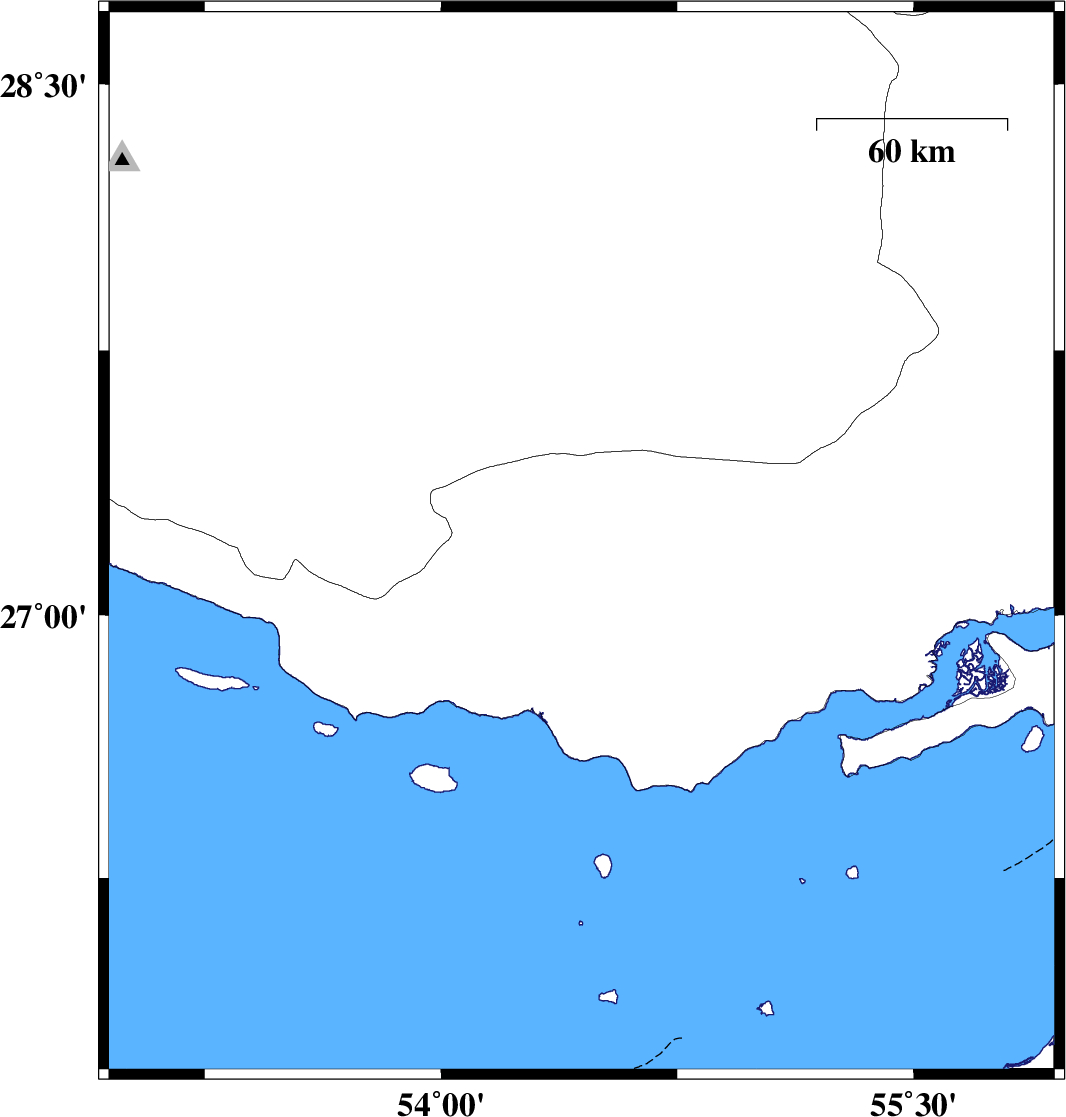 | 2017/09/17 | 23:54:25.0 | 04:24:25.0 | 27.473 | 53.505 | 15 | ML:2.8 | Fars Province, 37 km North-East of Lamerd | ||