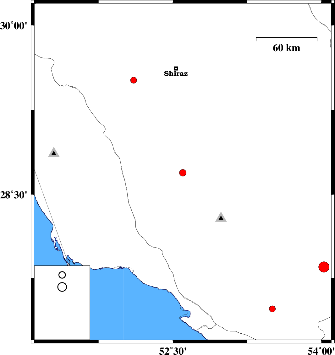 | 2017/09/16 | 05:16:21.3 | 09:46:21.3 | 29.515 | 52.103 | 14 | ML:2.8 | Fars Province, 43 km South-West of Shiraz |