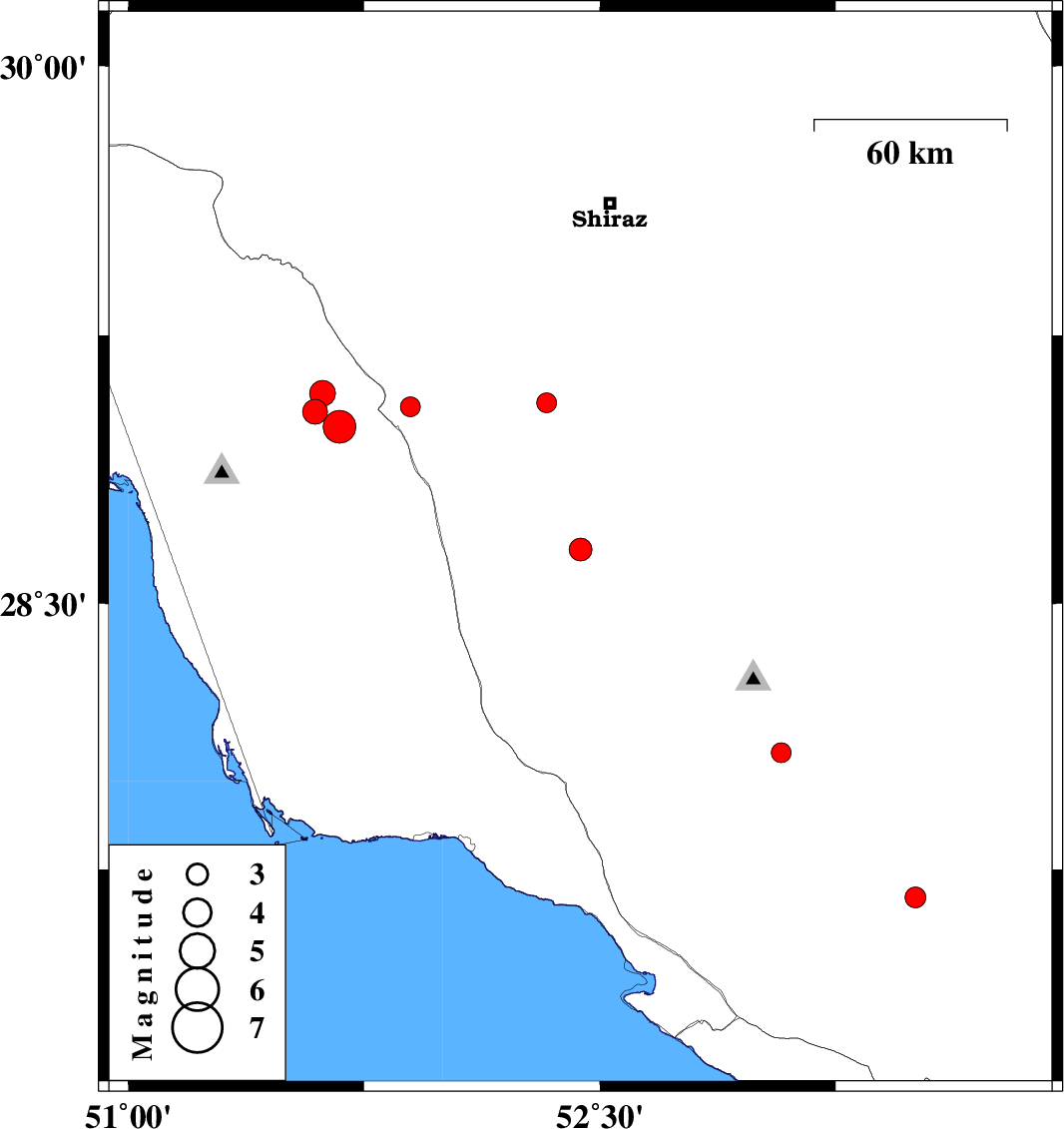 | 2017/09/04 | 02:30:11.4 | 07:00:11.4 | 28.08 | 53.076 | 10 | ML:2.8 | Fars Province, 43 km South of Qir va Karzin | ||