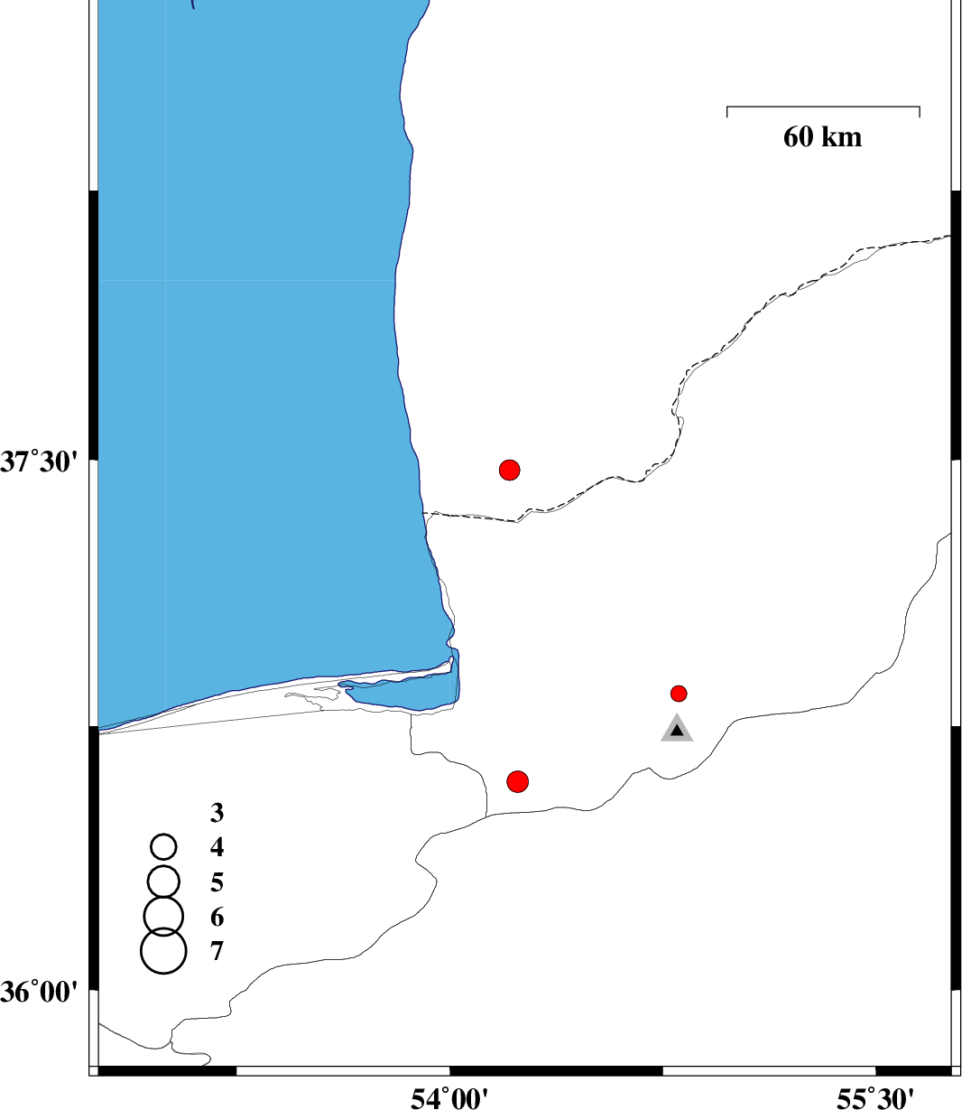 | 2017/09/25 | 22:20:30.3 | 01:50:30.3 | 37.282 | 54.264 | 14 | ML:3.3 | Golestan Province, 34 km North-West of Aq Qaleh | ||