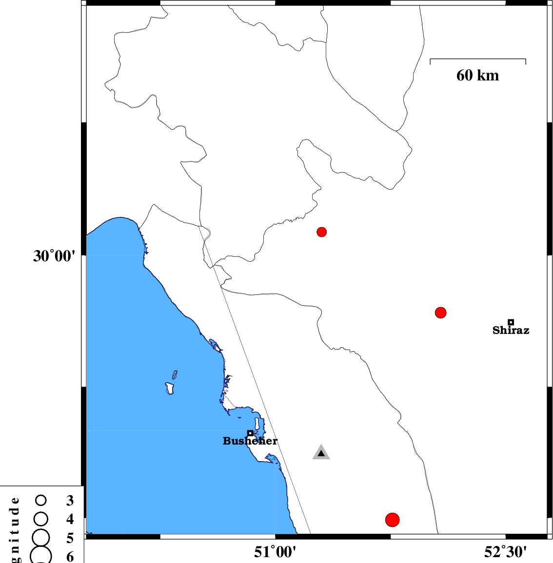 | 2017/10/02 | 06:22:28.1 | 09:52:28.1 | 29.906 | 51.269 | 14 | ML:2.8 | Fars Province, 34 km South-West of Nurabad | ||