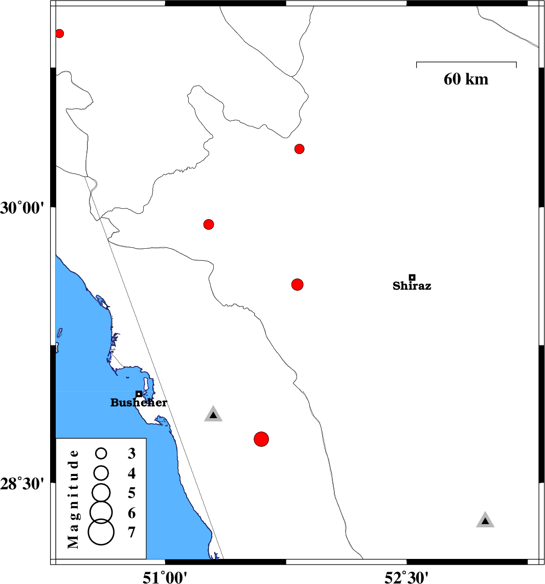 | 2017/10/02 | 06:22:28.1 | 09:52:28.1 | 29.906 | 51.269 | 14 | ML:2.8 | Fars Province, 34 km South-West of Nurabad | ||
