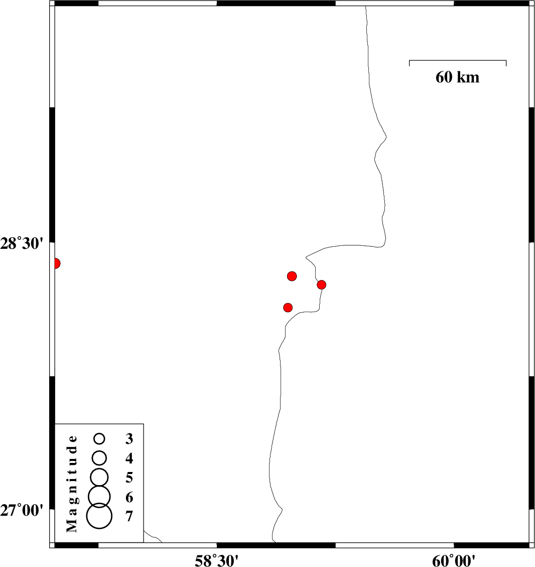 | 2017/10/04 | 08:24:46.3 | 11:54:46.3 | 28.135 | 58.949 | 14 | ML:2.5 | Kerman Province, 125 km North-East of Kahnuj | ||
