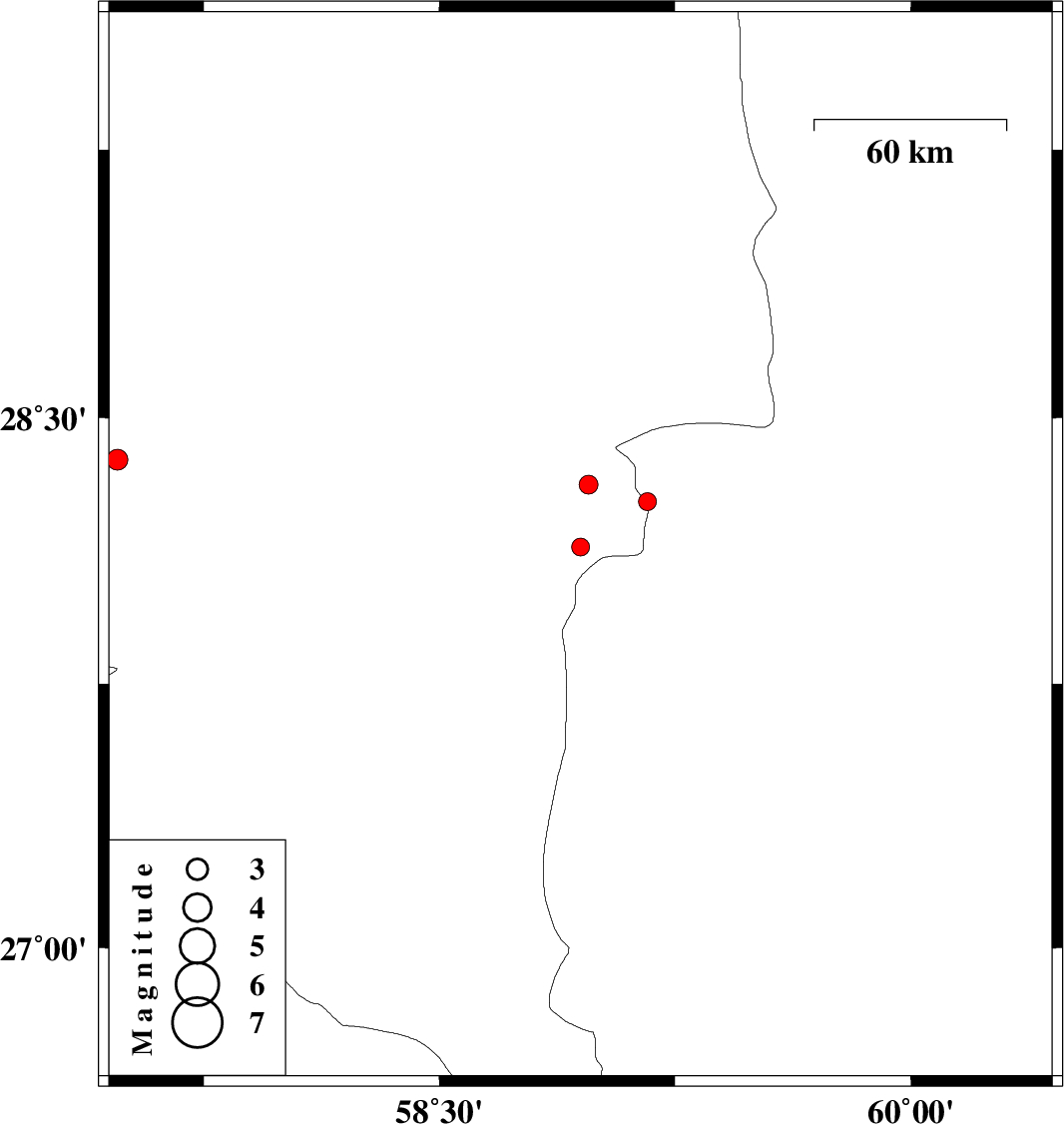 | 2017/10/04 | 08:24:46.3 | 11:54:46.3 | 28.135 | 58.949 | 14 | ML:2.5 | Kerman Province, 125 km North-East of Kahnuj | ||