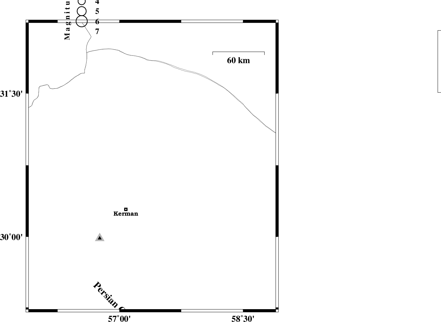 | 2017/10/07 | 01:06:59.8 | 04:36:59.8 | 30.731 | 57.397 | 14 | ML:2.7 | Kerman Province, 58 km North-East of Kerman | ||