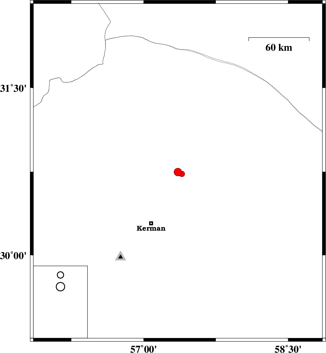| 2017/10/11 | 03:58:21.4 | 07:28:21.4 | 30.747 | 57.356 | 14 | ML:3.6 | Kerman Province, 58 km North-East of Kerman | ||