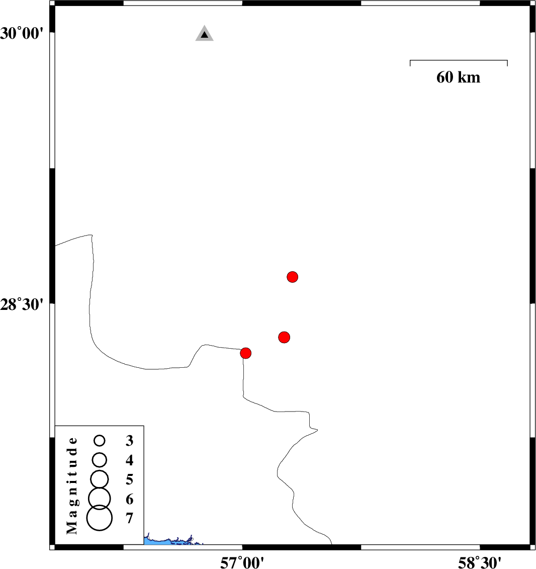 | 2017/10/11 | 20:09:22.4 | 23:39:22.4 | 28.222 | 57.021 | 14 | ML:3.1 | Kerman Province, 73 km North-West of Kahnuj |