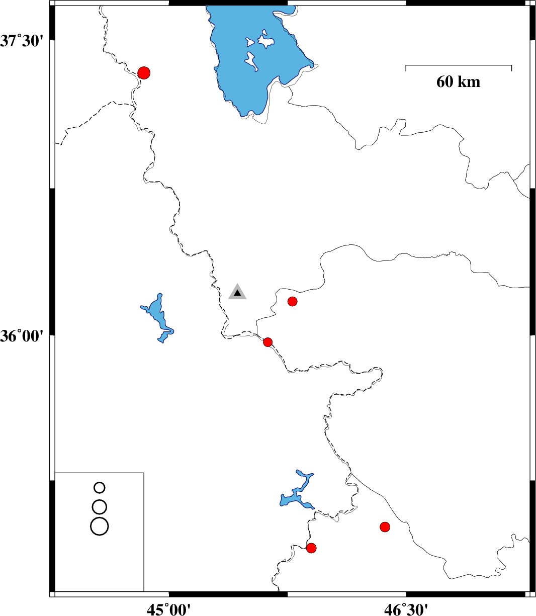| 2017/09/26 | 06:57:02.1 | 10:27:02.1 | 37.333 | 44.842 | 14 | ML:3.5 | Azarbaijan Gharbi Province, 31 km South-West of Orumiyeh | ||
