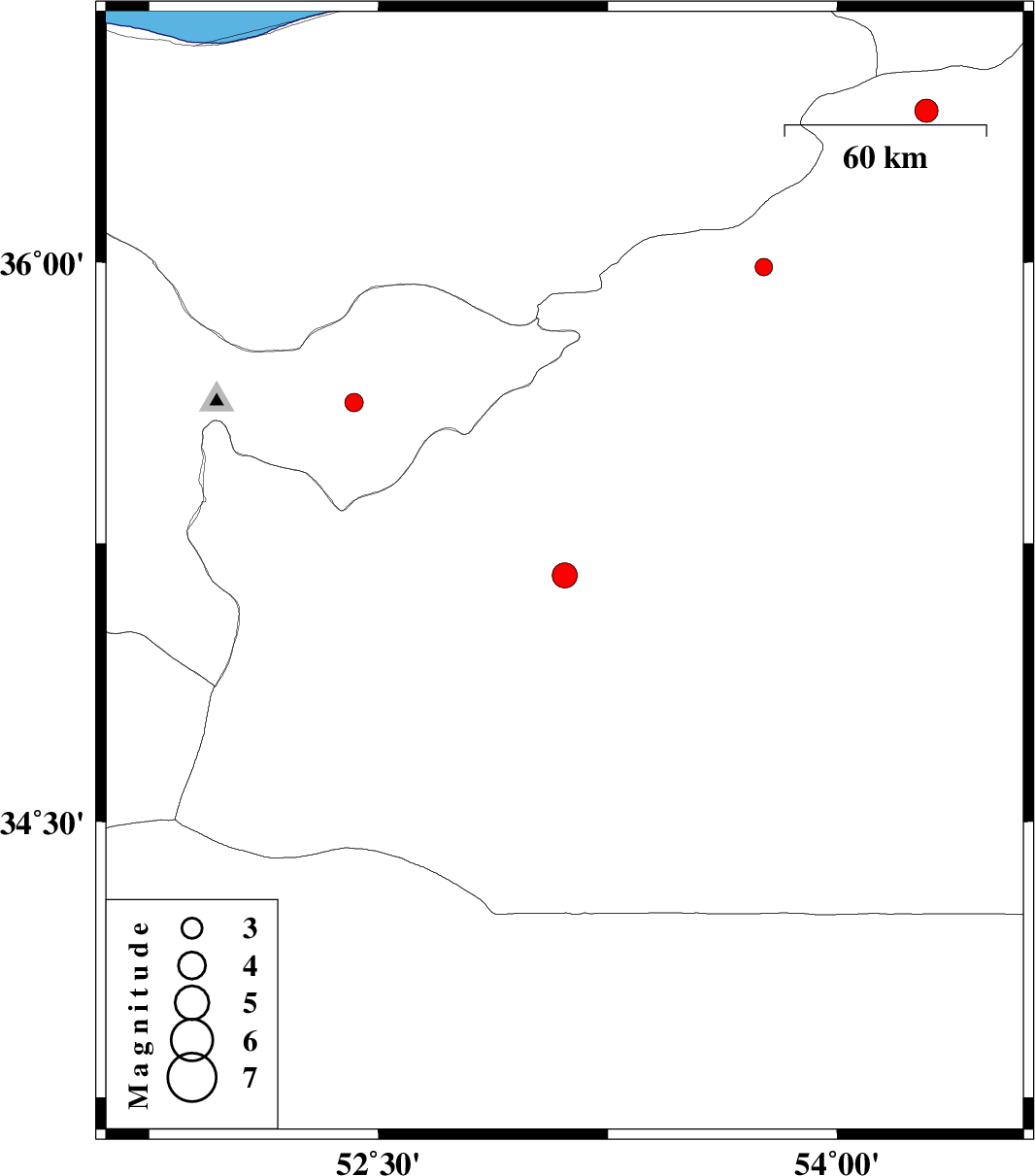 | 2017/09/23 | 00:22:18.7 | 03:52:18.7 | 36.402 | 54.292 | 15 | ML:3.4 | Semnan Province, 27 km North of Damghan |
