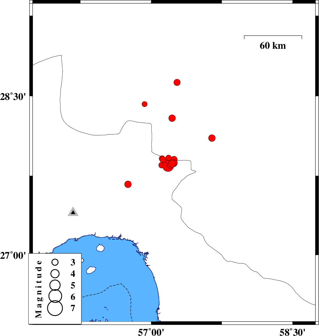 2017/10/23 02:43:37.8 06:13:37.8 27.93857.22518 ML:2.7 Kerman Province, 46 km -West of Kahnuj