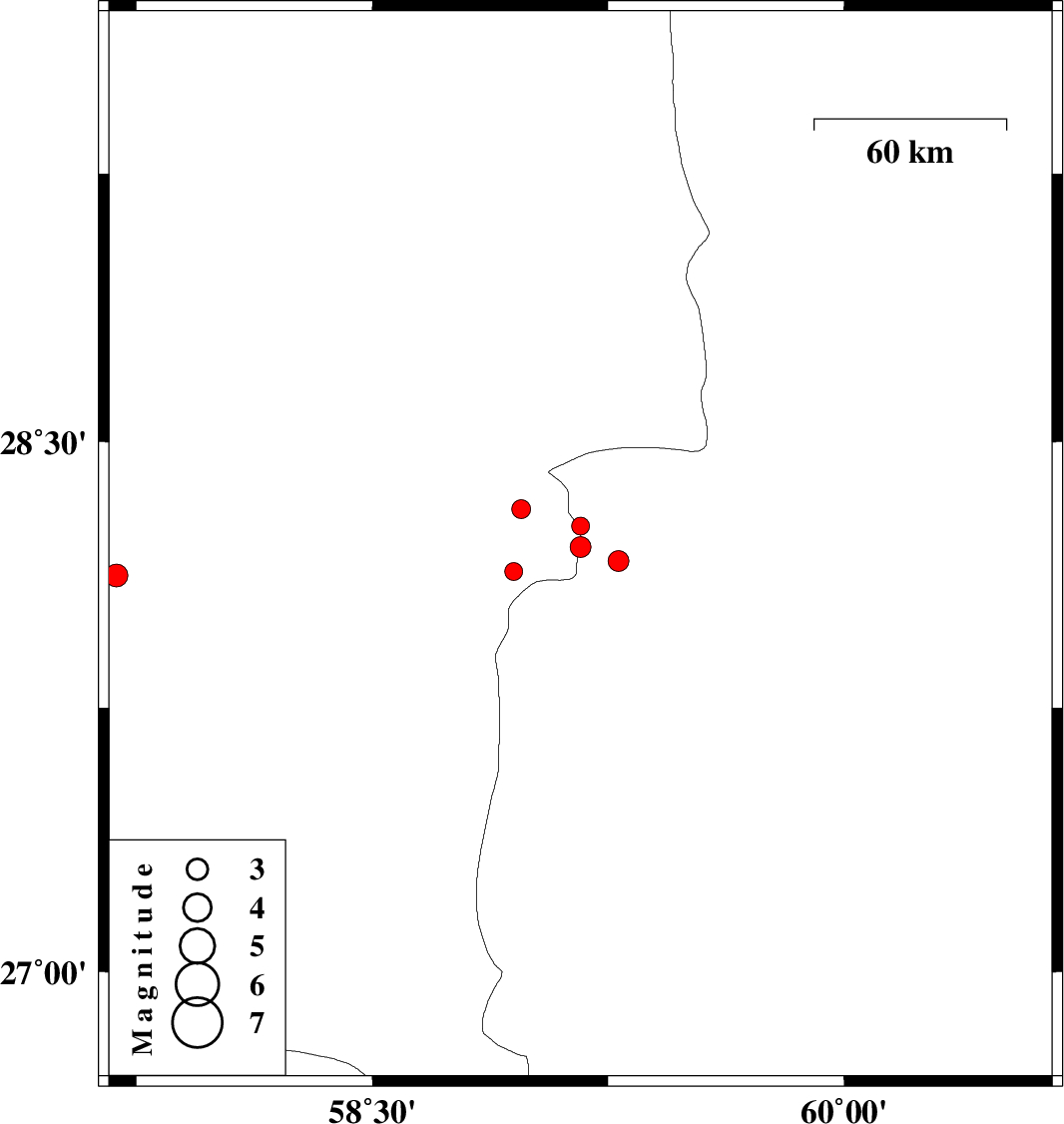 | 2017/10/04 | 08:24:46.3 | 11:54:46.3 | 28.135 | 58.949 | 14 | ML:2.5 | Kerman Province, 125 km North-East of Kahnuj | ||