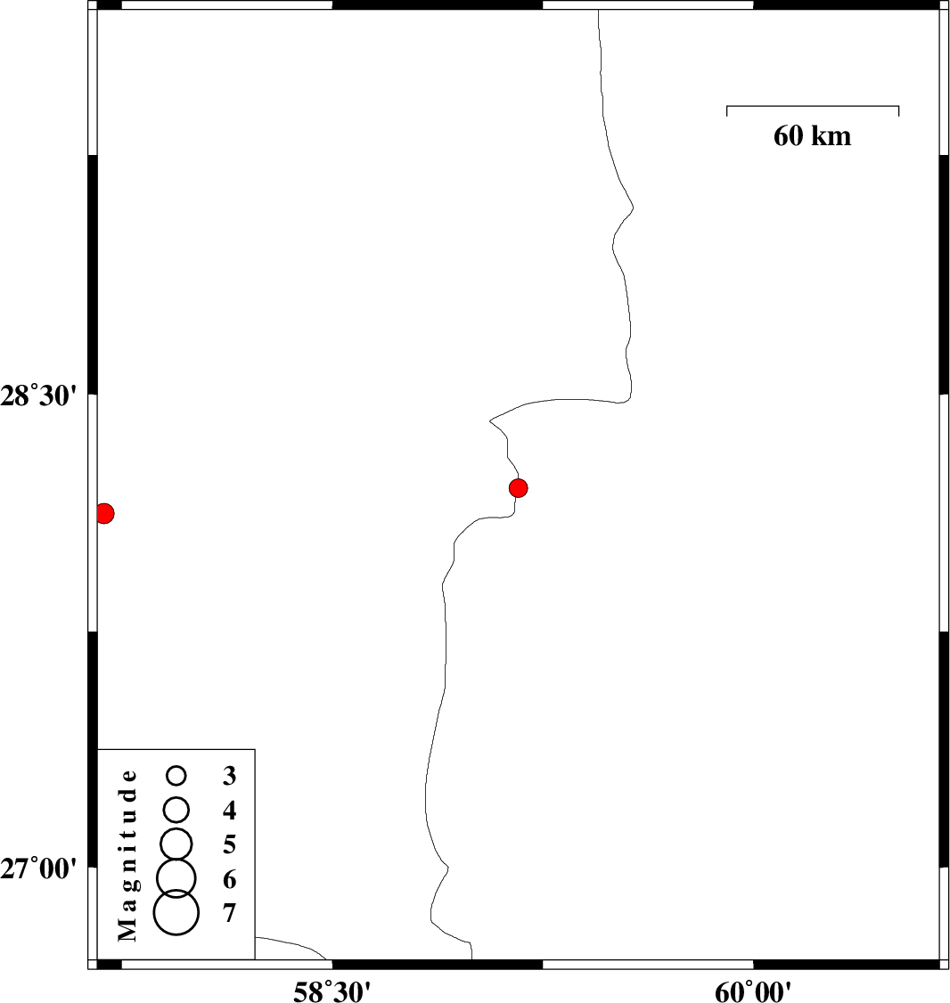 | 2017/10/20 | 08:24:52.1 | 11:54:52.1 | 28.124 | 57.686 | 18 | ML:3.2 | Kerman Province, 19 km North of Kahnuj |