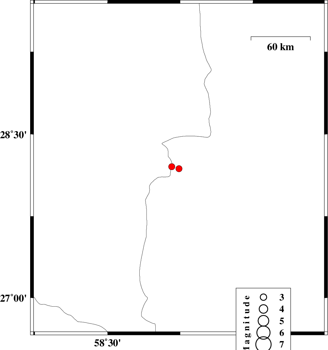 | 2017/10/27 | 07:10:18.4 | 10:40:18.4 | 28.186 | 59.237 | 15 | ML:2.9 | Sistan va Baloochestan Province, 154 km North-East of Kahnuj | ||