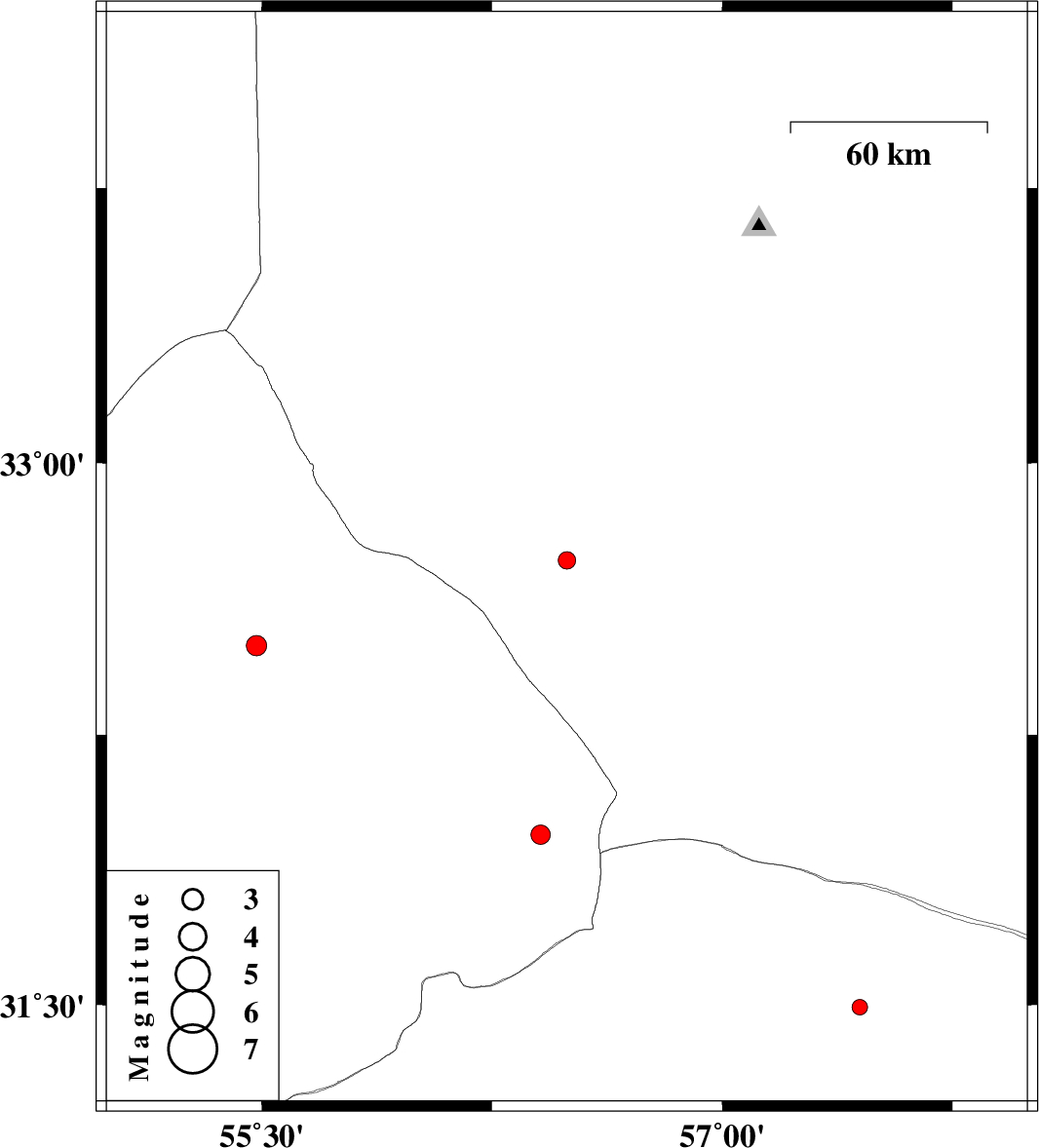 | 2017/10/28 | 19:11:10.4 | 22:41:10.4 | 32.731 | 56.494 | 14 | ML:2.6 | Yazd Province, 105 km South-West of Tabas | ||