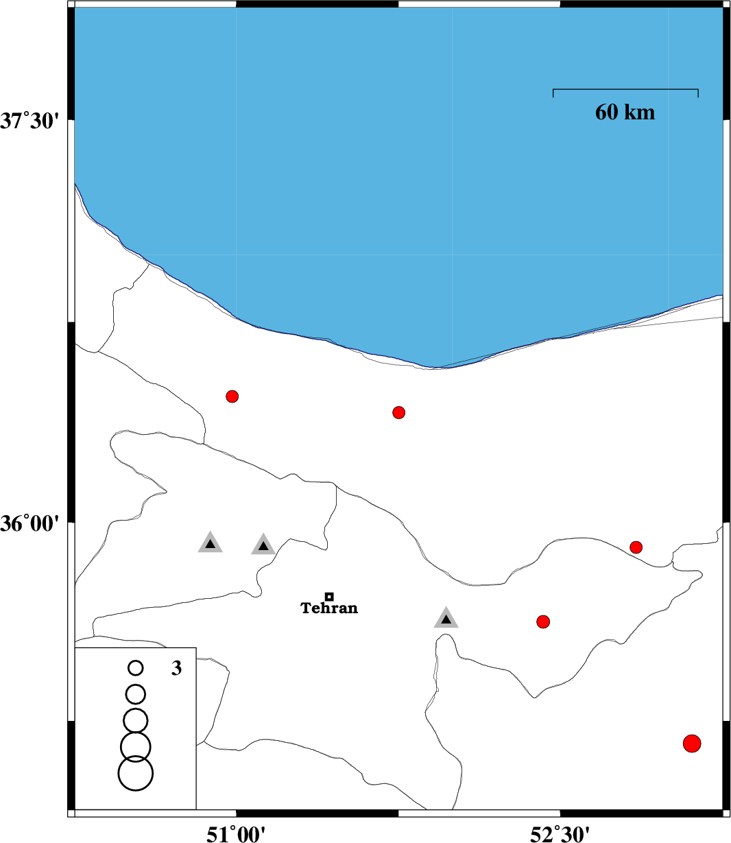 | 2017/10/31 | 03:46:37.2 | 07:16:37.2 | 36.412 | 51.752 | 6 | ML:2.5 | Mazandaran Province, 31 km South-West of Nur | ||