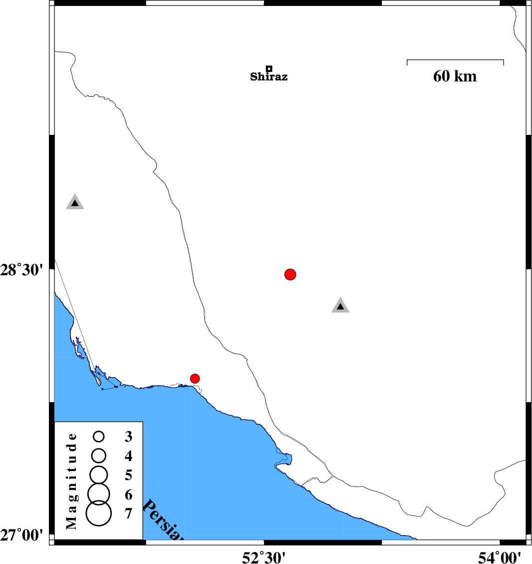 | 2017/10/27 | 00:29:49.4 | 03:59:49.4 | 27.883 | 52.06 | 27 | ML:2.7 | Bushehr Province, 6 km of Bandar-e kangan |
