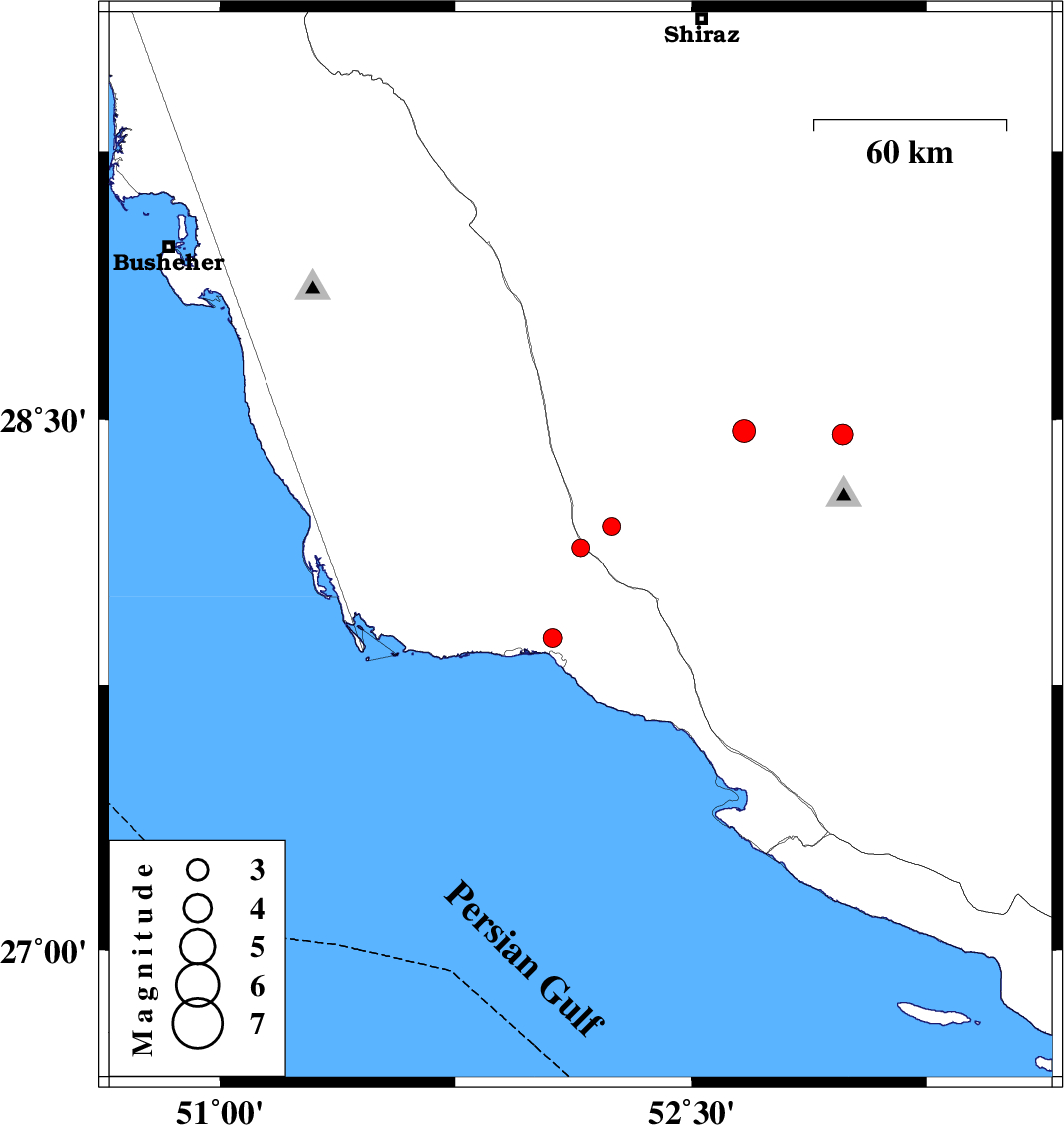 | 2017/11/01 | 07:35:34.5 | 11:05:34.5 | 28.458 | 52.984 | 14 | ML:2.9 | Fars Province, 5 km of Qir va Karzin | ||