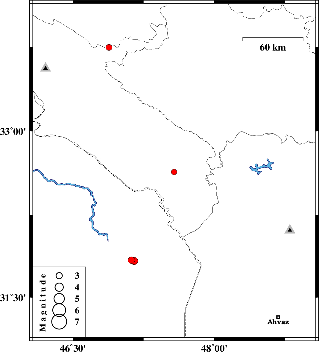 | 2017/10/20 | 02:19:40.9 | 05:49:40.9 | 31.838 | 47.121 | 15 | ML:3.2 | Iraq, 96 km South-West of Dehloran | ||