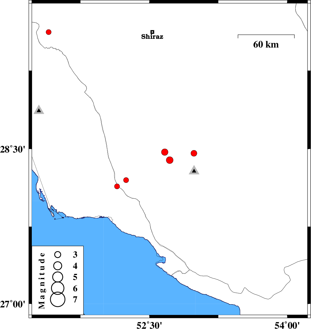 | 2017/11/05 | 01:10:10.6 | 04:40:10.6 | 29.617 | 51.404 | 8 | ML:2.6 | Fars Province, 24 km -West of Kazerun | ||