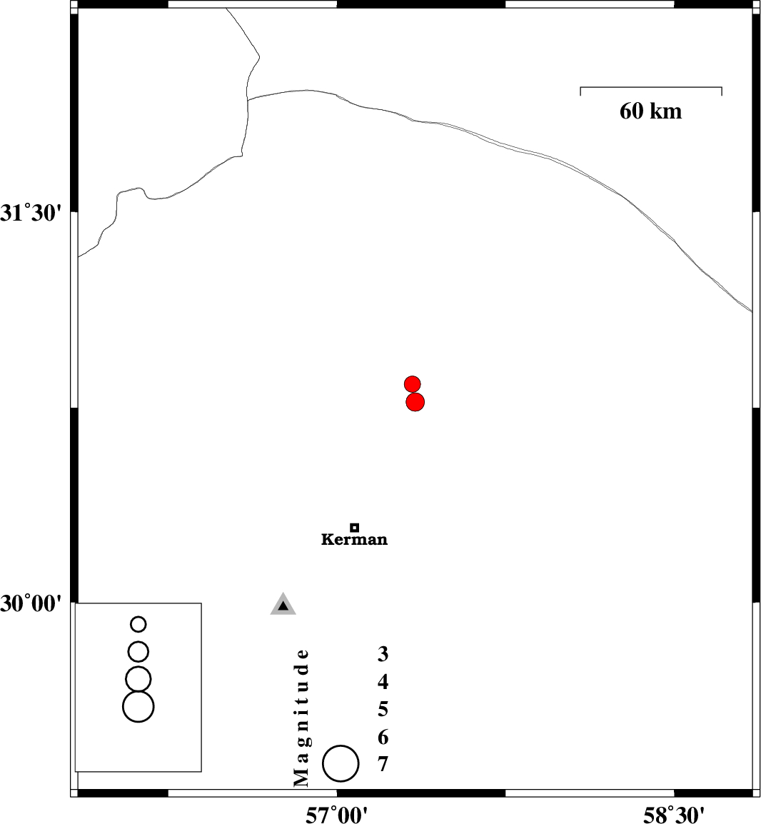 | 2017/11/06 | 21:55:14.1 | 01:25:14.1 | 30.773 | 57.348 | 6 | ML:3.3 | Kerman Province, 60 km North-East of Kerman | ||