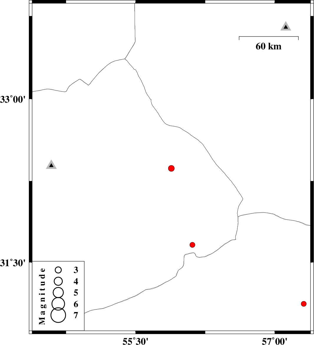 | 2017/03/16 | 04:26:05.2 | 07:56:05.2 | 31.662 | 56.112 | 14 | ML:2.5 | Yazd Province, 68 km -East of Bafq |