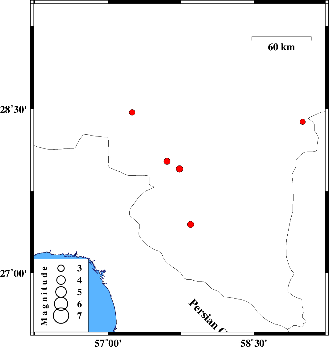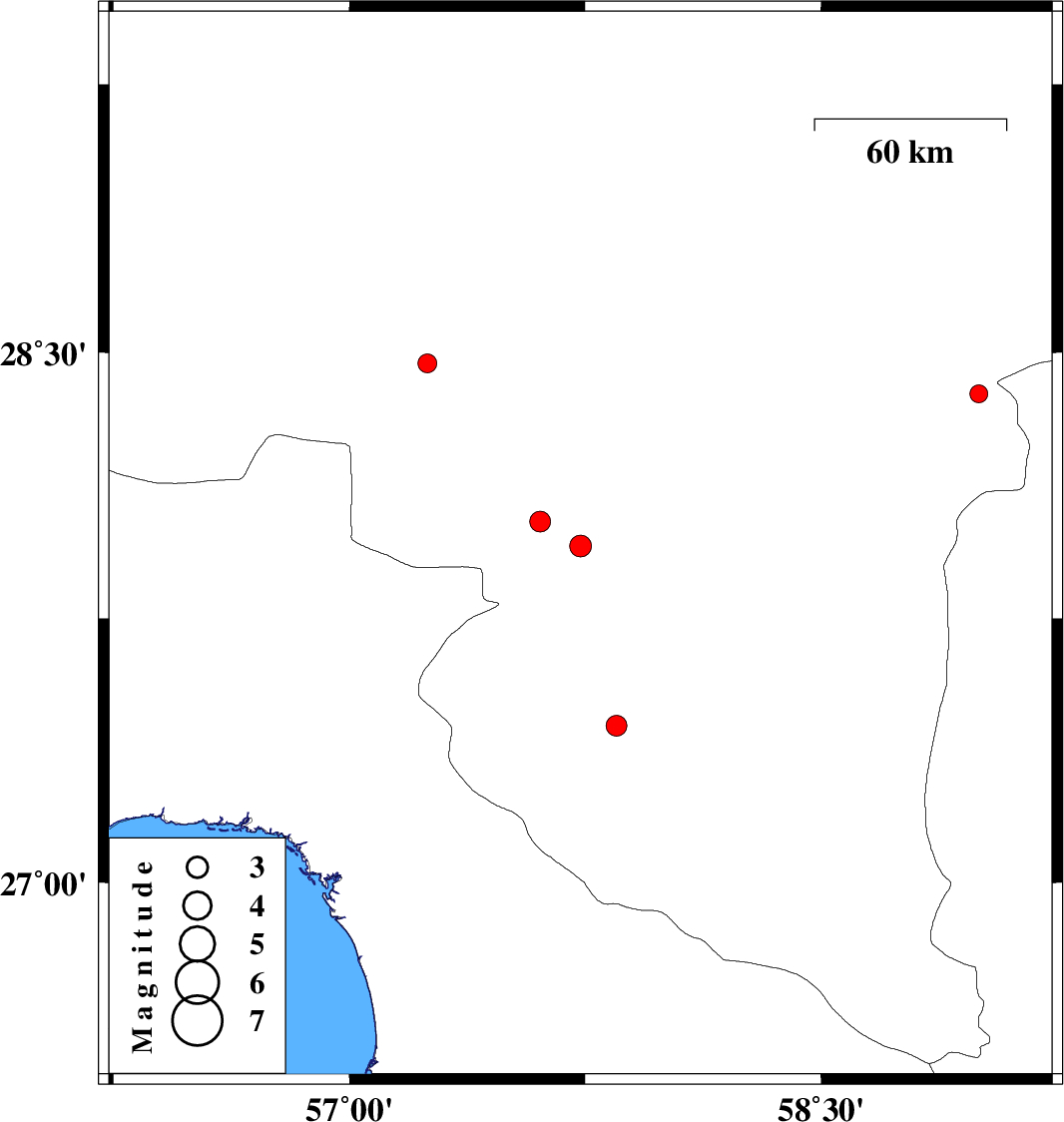 | 2017/03/13 | 06:51:56.4 | 10:21:56.4 | 28.024 | 57.606 | 14 | ML:2.9 | Kerman Province, 12 km of Kahnuj |