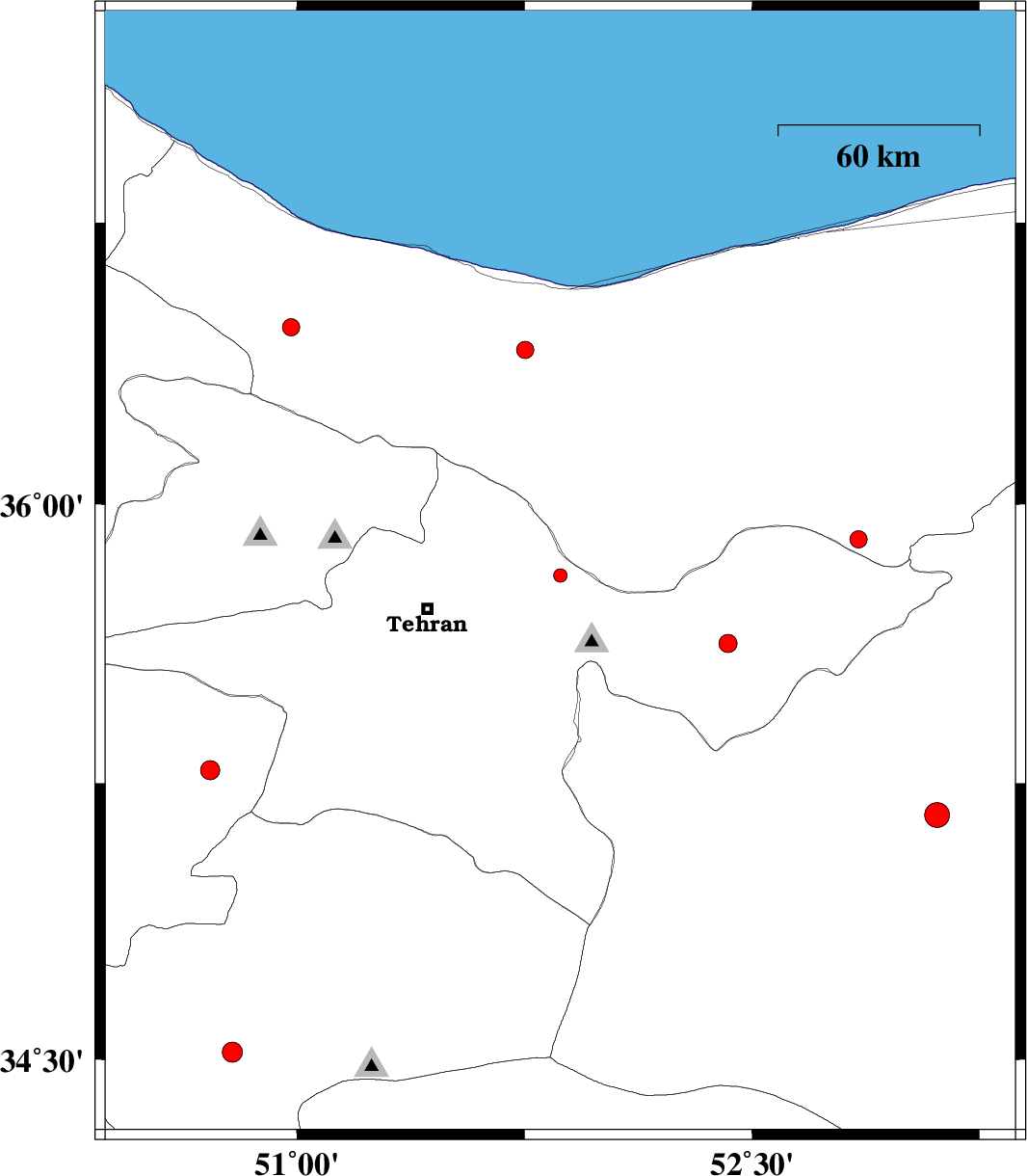 | 2017/10/14 | 02:09:25.6 | 05:39:25.6 | 35.626 | 52.421 | 24 | ML:2.7 | Tehran Province, 33 km -East of Damavand | ||