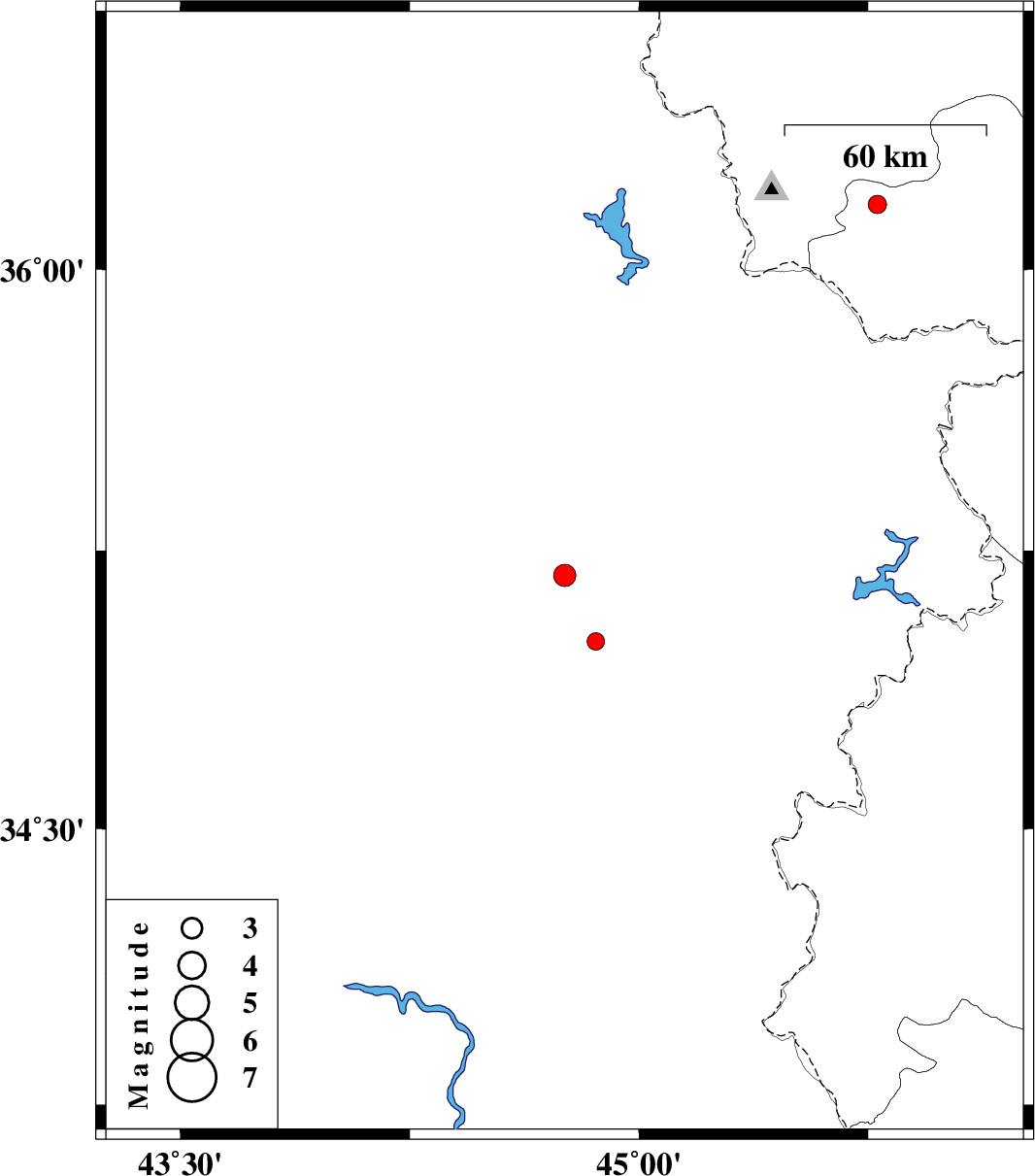 | 2017/11/07 | 13:59:20.2 | 17:29:20.2 | 35.006 | 44.859 | 14 | ML:2.6 | Iraq, 81 km South-West of Sulaymaniyah | ||