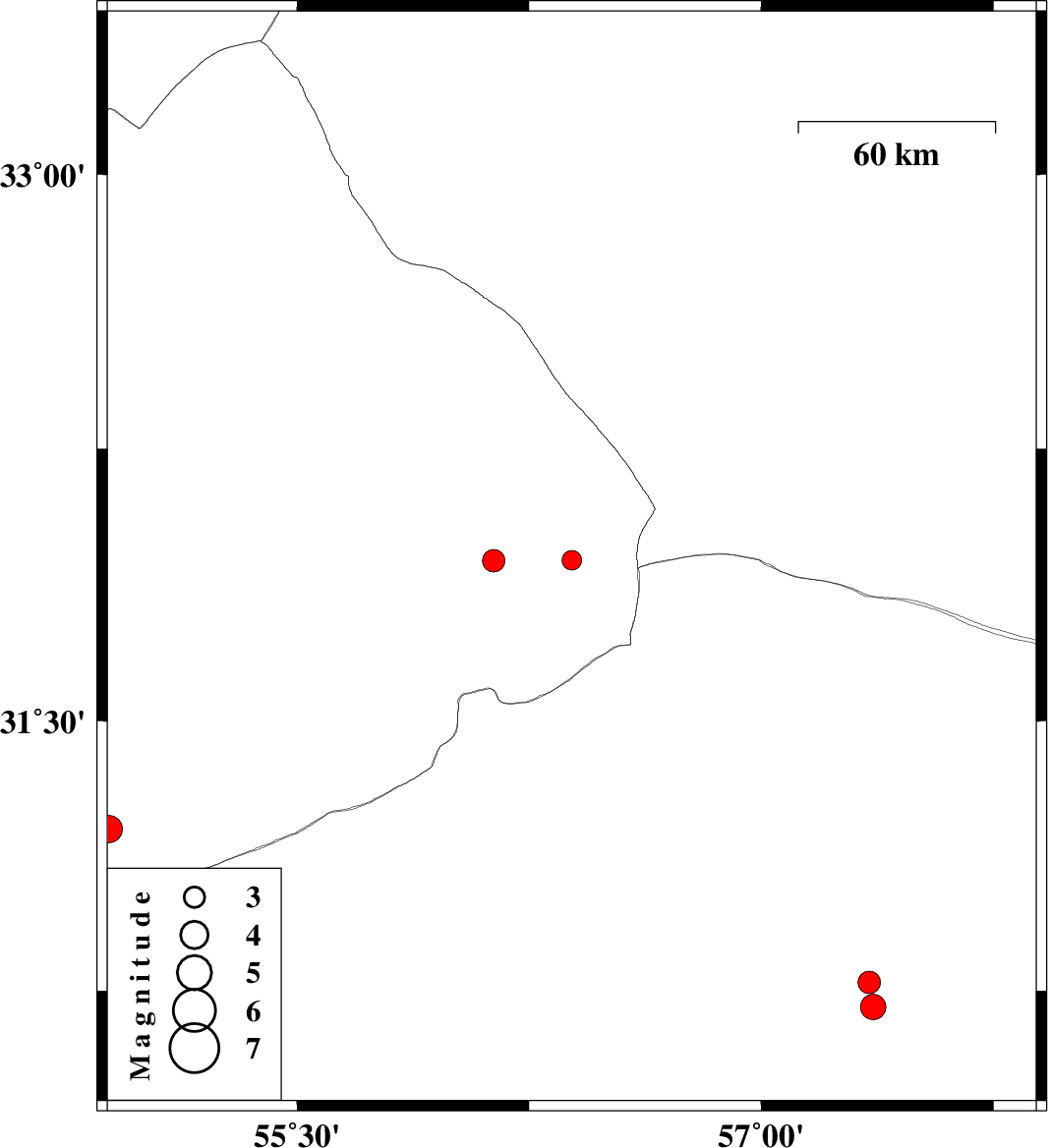 | 2017/11/06 | 21:55:14.1 | 01:25:14.1 | 30.773 | 57.348 | 6 | ML:3.3 | Kerman Province, 60 km North-East of Kerman | ||