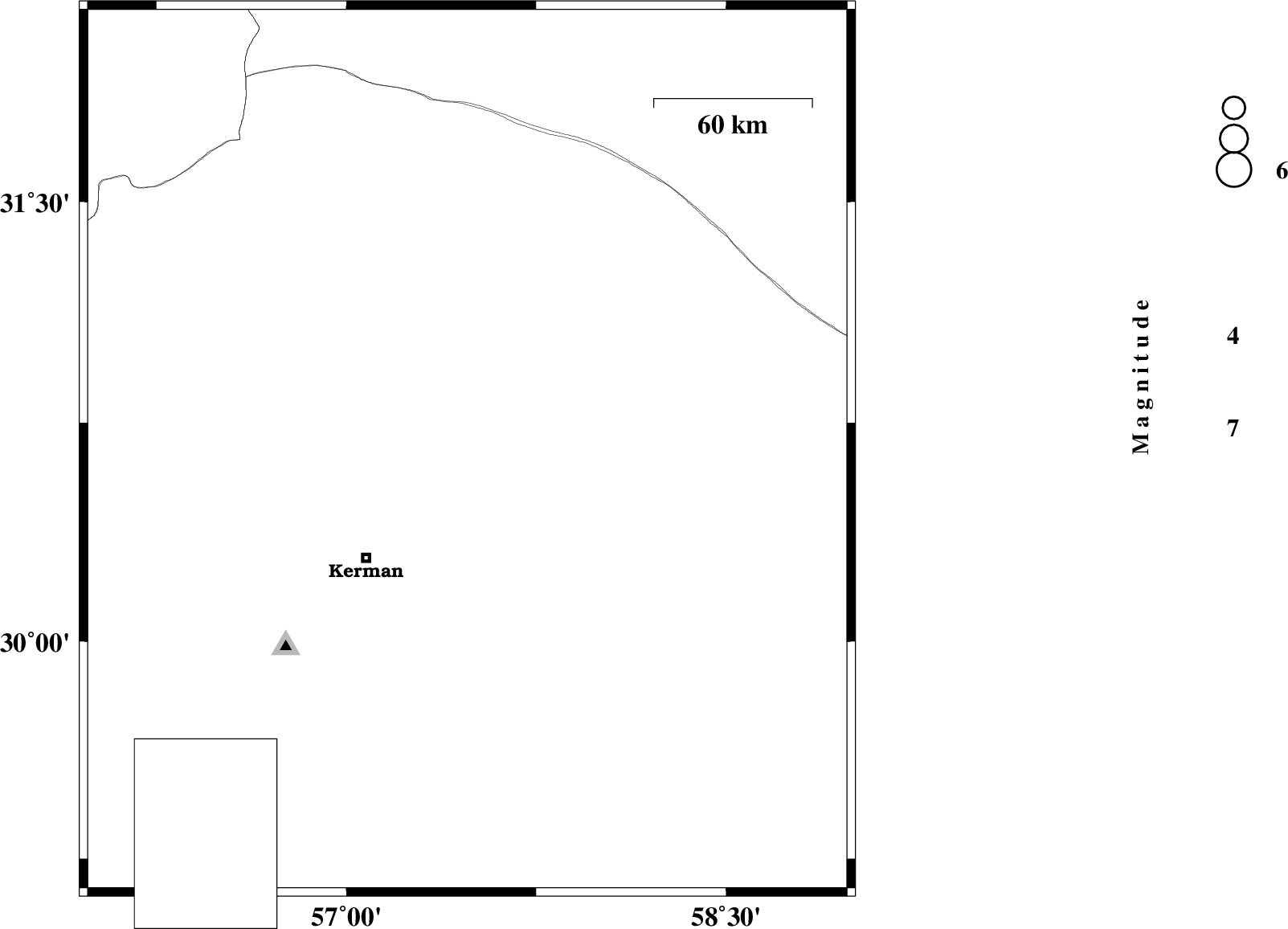 | 2017/11/18 | 07:28:38.4 | 10:58:38.4 | 30.137 | 57.592 | 15 | ML:3.6 | Kerman Province, 52 km South-East of Kerman | ||