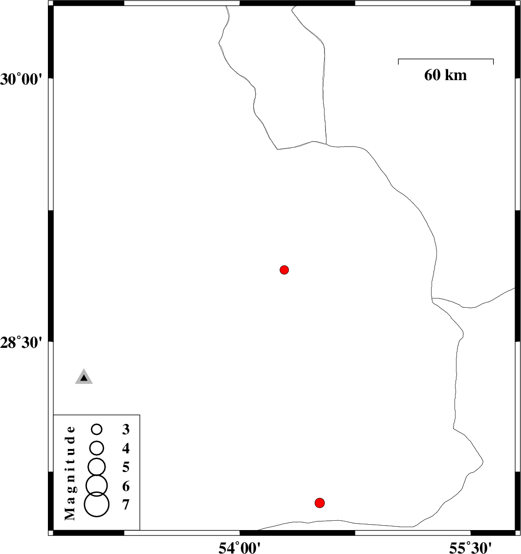 | 2017/11/15 | 00:28:13.2 | 03:58:13.2 | 28.91 | 54.289 | 14 | ML:2.6 | Fars Province, 33 km South of Neyriz | ||